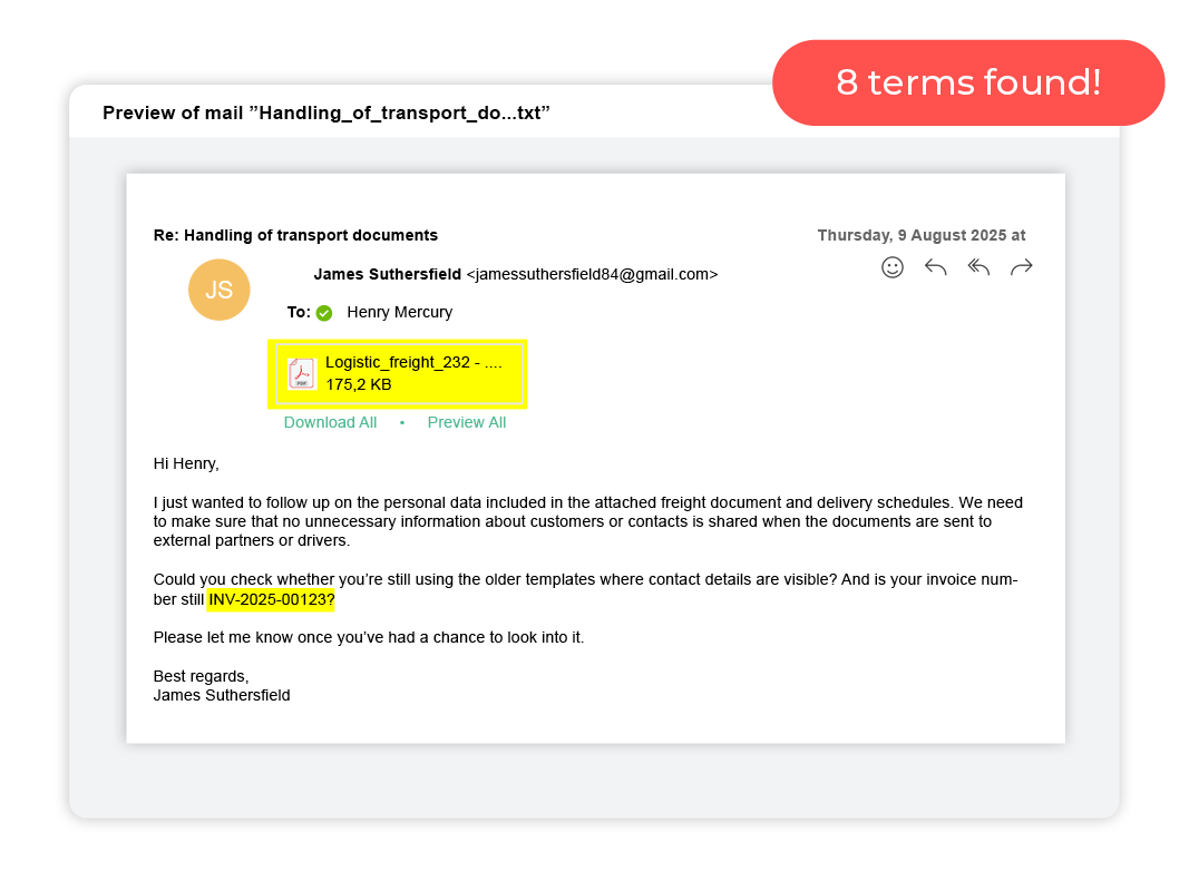 DataMapper is an IT tool that uses artificial intelligence to identify documents, emails, and images containing sensitive terms. It gives you the opportunity to finally clean up files with personal data and other sensitive information so you can comply with privacy regulations such as the UK GDPR. The cleanup becomes more accurate and significantly faster than if you had to do it manually.