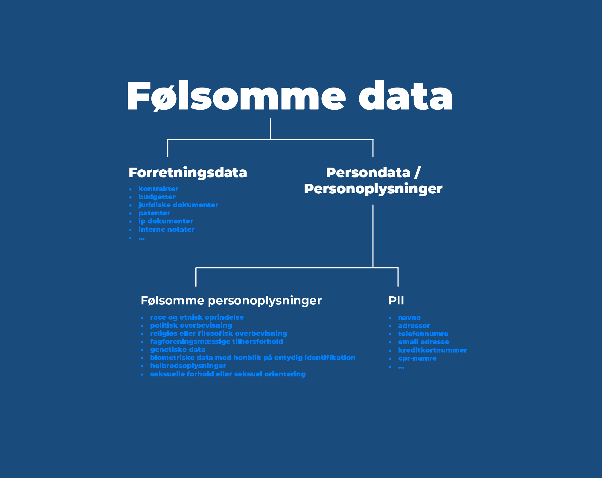 Det korte svar: Følsomme data kan opdeles i to hovedtyper: forretningsdata og persondata. Forretningsdata omfatter f.eks. kontrakter, budgetter og juridiske dokumenter, mens persondata kan deles op i PII (personligt identificerbare oplysninger) og følsomme personoplysninger. Begge typer kræver beskyttelse i henhold til GDPR.