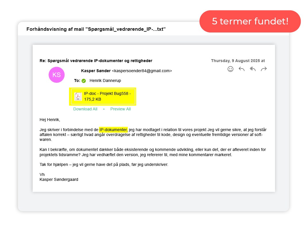 Dokumenter, mails og billeder fundet i virksomhedens systemer.