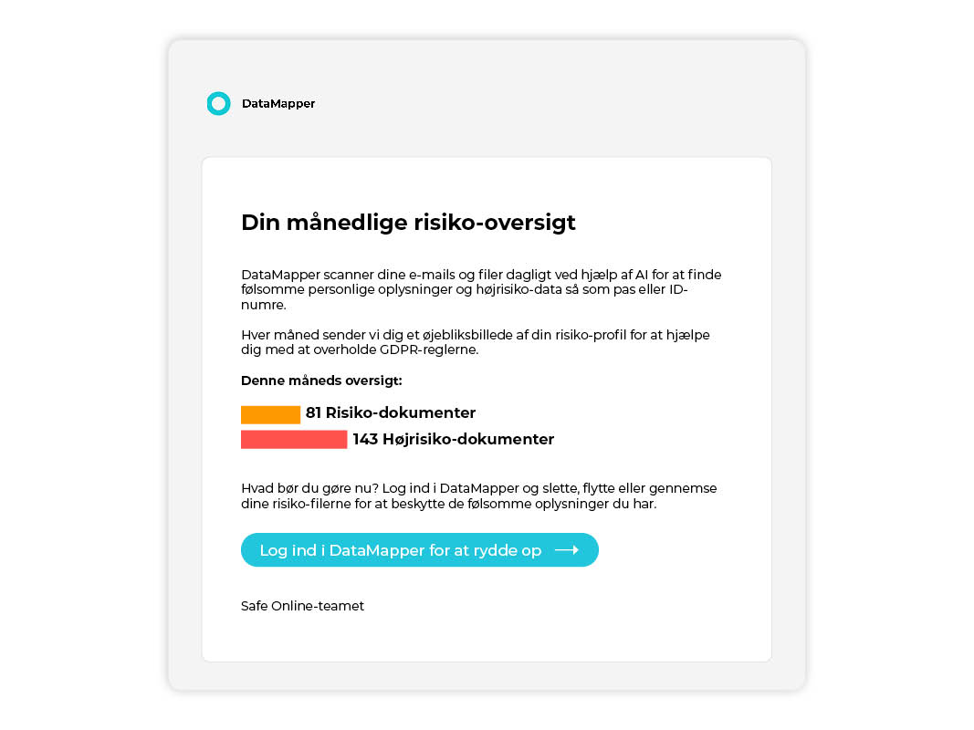 -Vil I have overblikket over jeres følsomme data, så få udarbejdet en GDPR Risikovurdering i form af en rapport. Denne løsning er populær for virksomheder, der er usikre på hvilke følsomme data, de har liggende. Læs mere her.