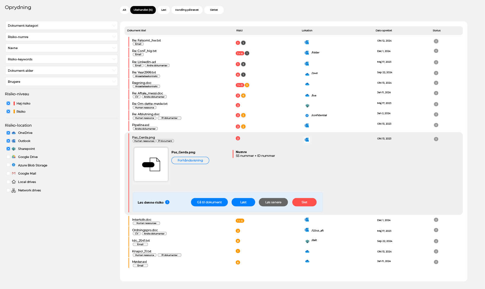 Filer med GDPR-risiko kategoriseres efter alder, filplacering, filtype, typen af personoplysning, risiko-ord, risiko-nummer og hvilke person der er relateret til filen. Det er muligt at sortere og filtrere efter disse kategorier, hvilket gør det let for jer at få et overblik over jeres filer.