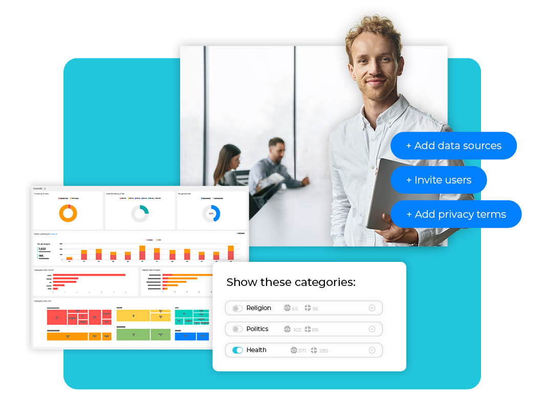 As an admin, you select the data systems you want to clean up. Then, you invite the employees that you want to clean-up. You can add terms that are important to your organisation – and exclude those that create unnecessary noise. Finally, you can set custom clean-up rules to fit your needs.